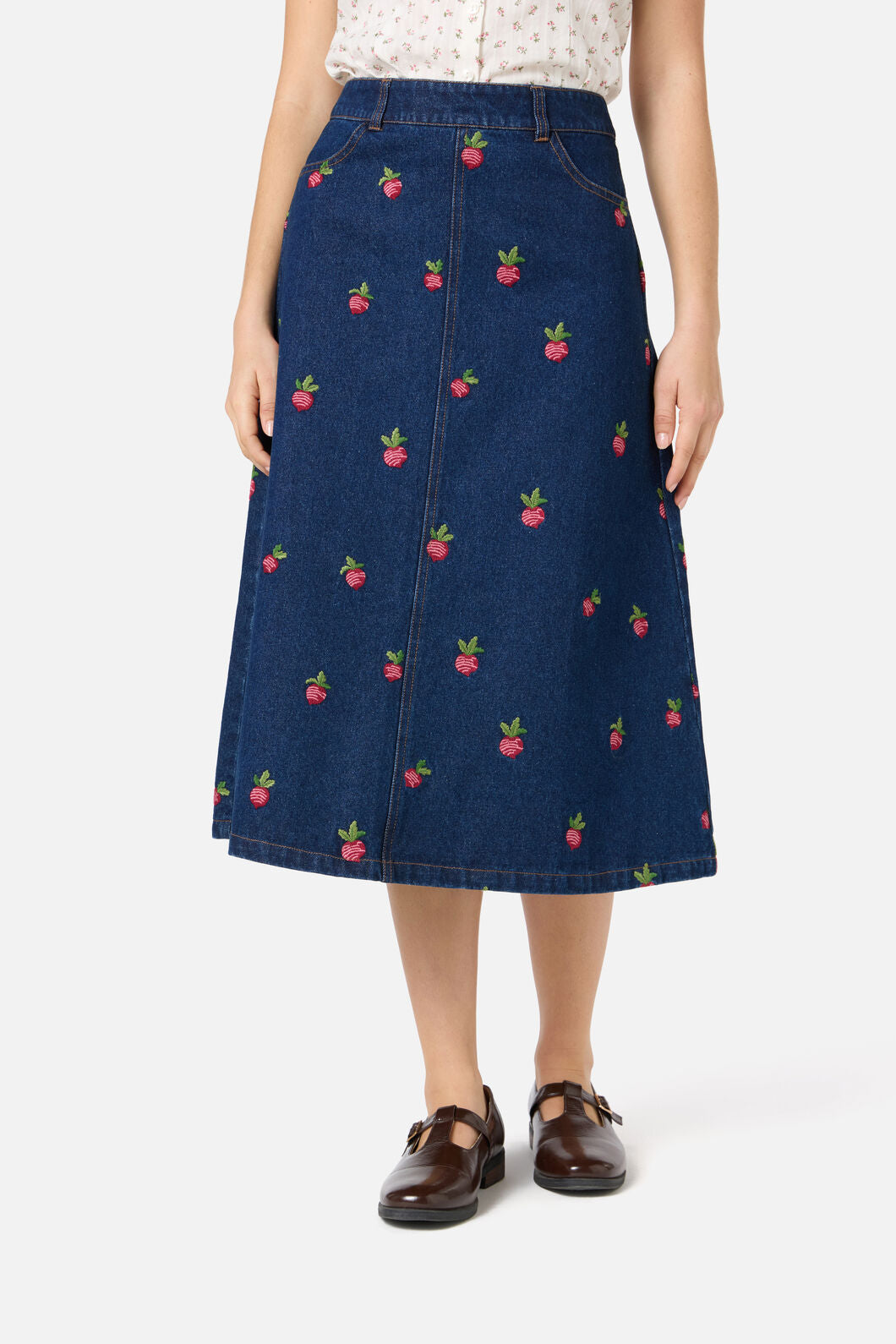 A fresh twist on a classic silhouette, this A-line midi skirt features charming radish embroidery for a garden-to-garment vibe.
