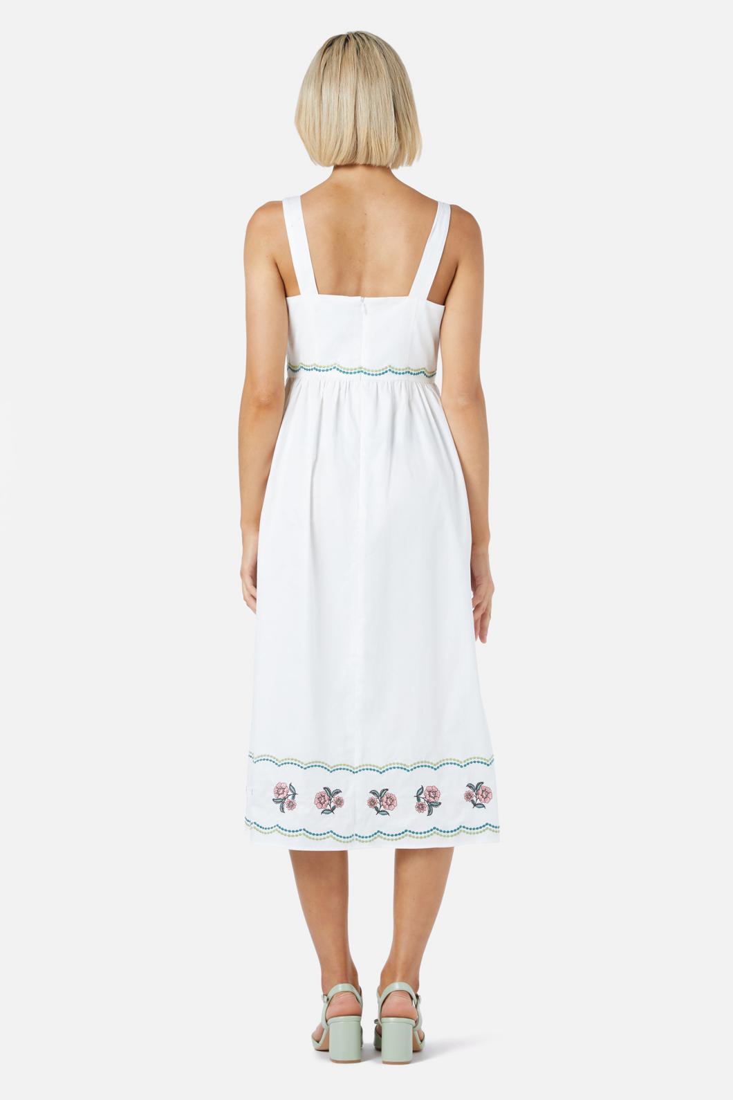 A charming midi sundress featuring retro-style floral embroidery and delicate scallop details, perfect for a vintage-inspired look.