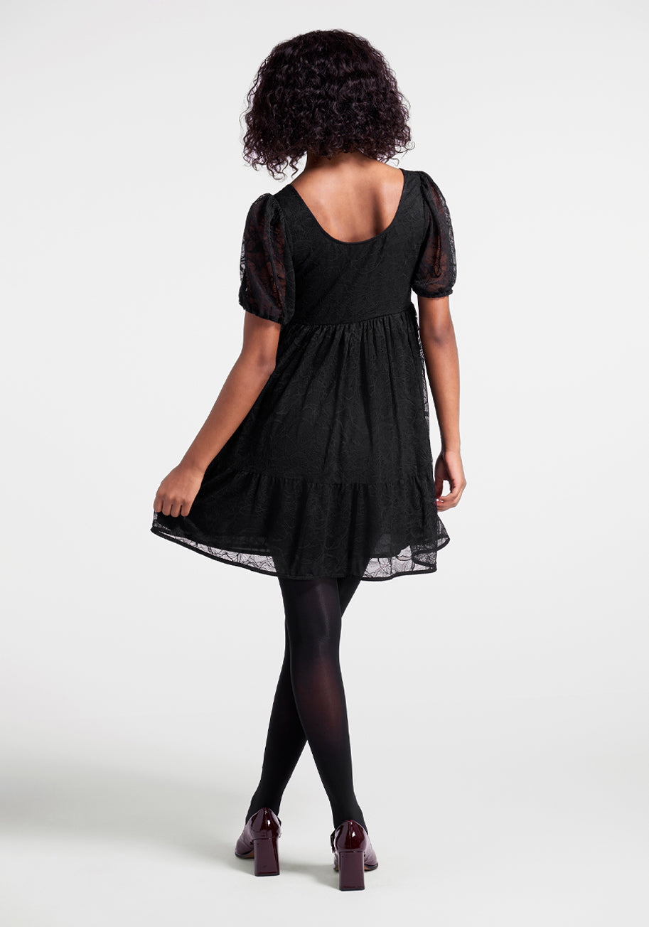 With a 1970’s inspired silhouette this black top features an ultra-unique lace overlay adorned with a mesmerizing mushroom design! Made from a delicately woven fabric, this gorgeous black lace dress is fully-lined except at the short puff sleeves and boasts a scoop neckline, decorative button detailing at the front bodice, an elasticized empire waistline, and an adorable tiered skirt that finishes above the knee.