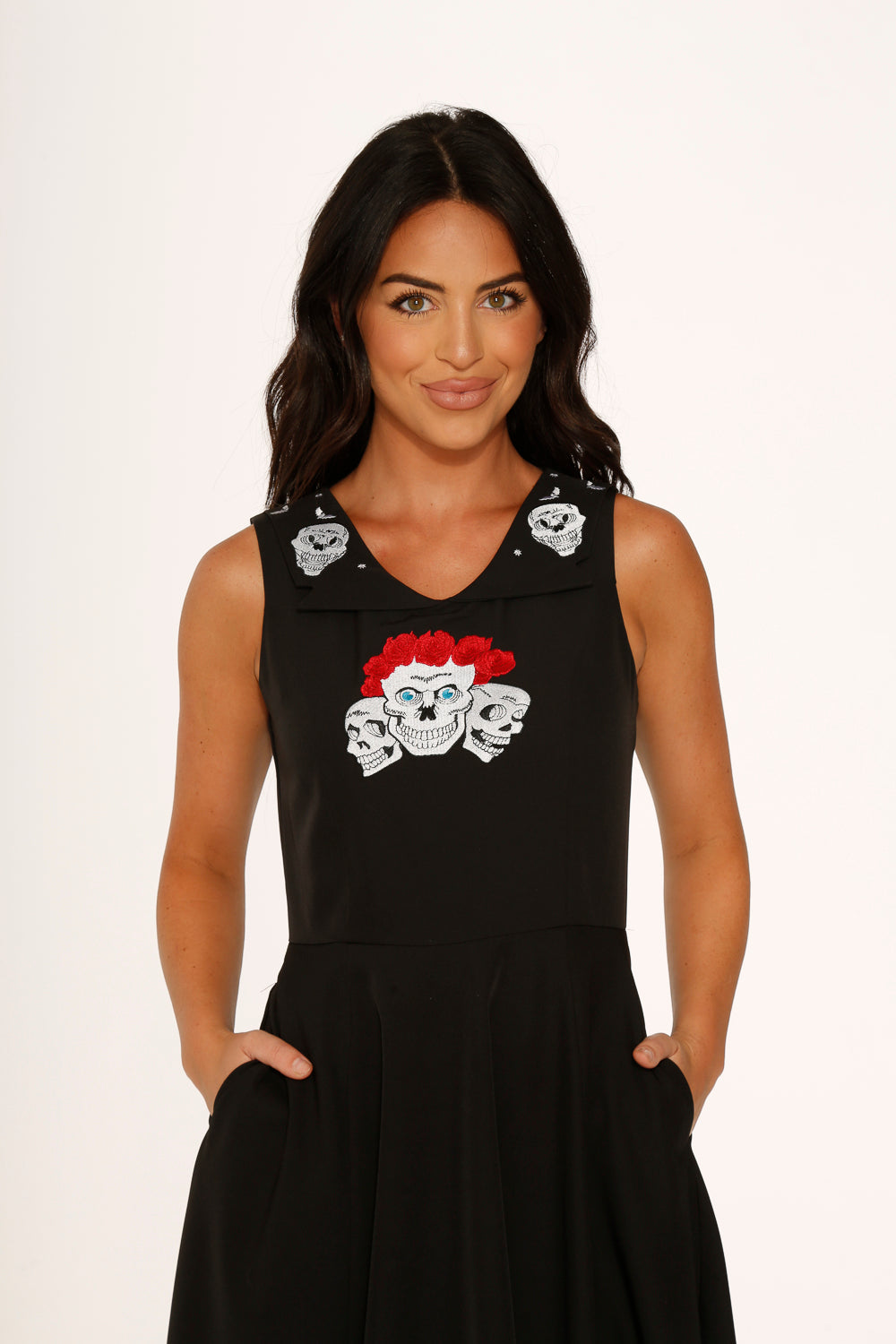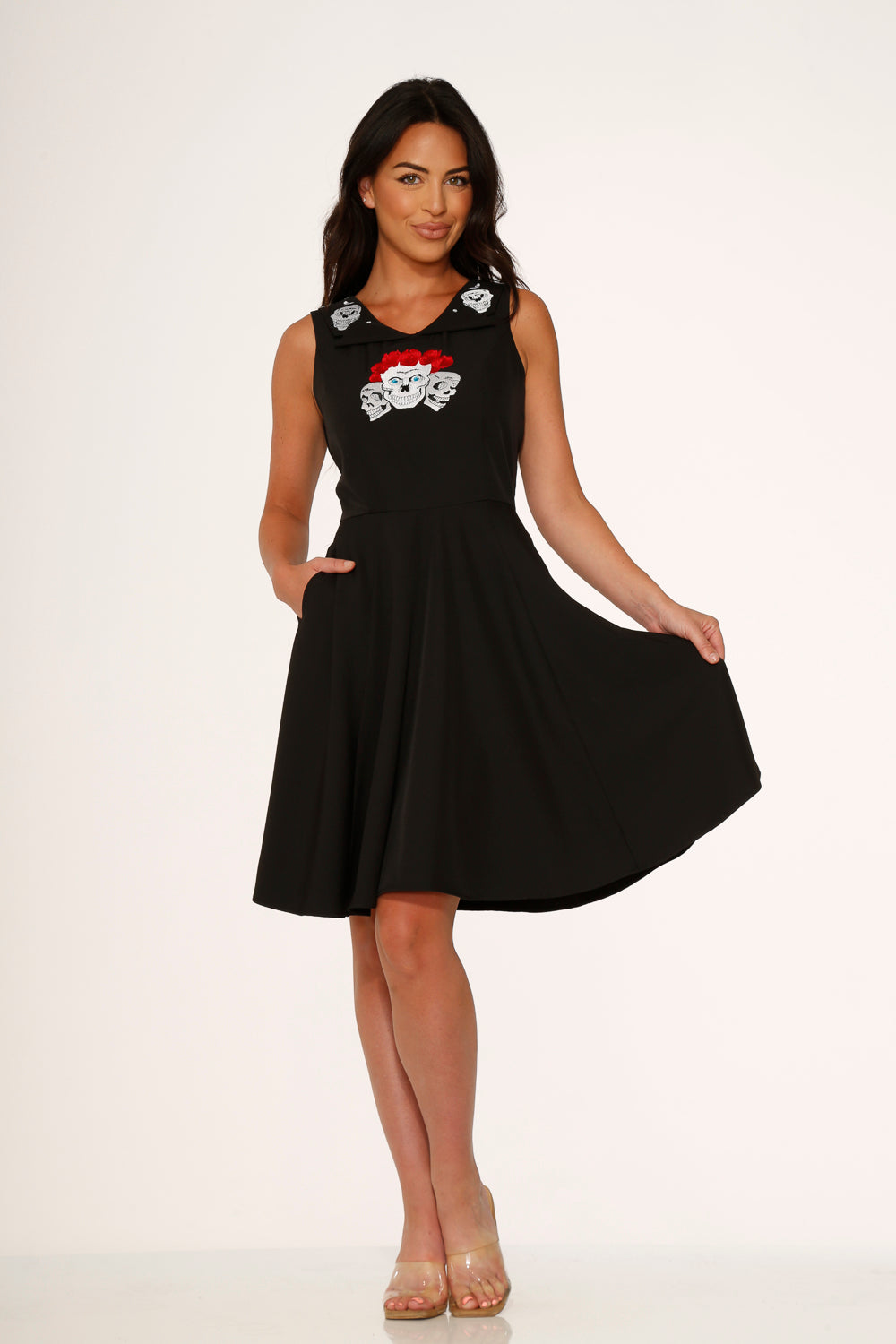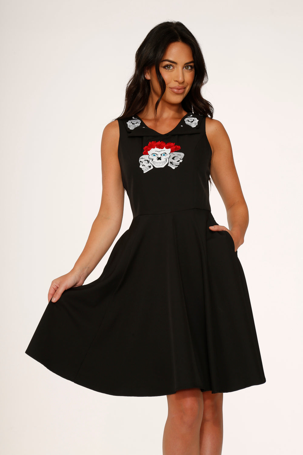 Gothic romance meets retro charm in this show-stopping swing dress by Orchid Bloom. A striking collar embroidered with classic skulls and bold red roses adds a dramatic twist to a timeless silhouette. Crafted in a comfy stretch fabric with a flattering fit-and-flare cut and a full skirt made for twirling.