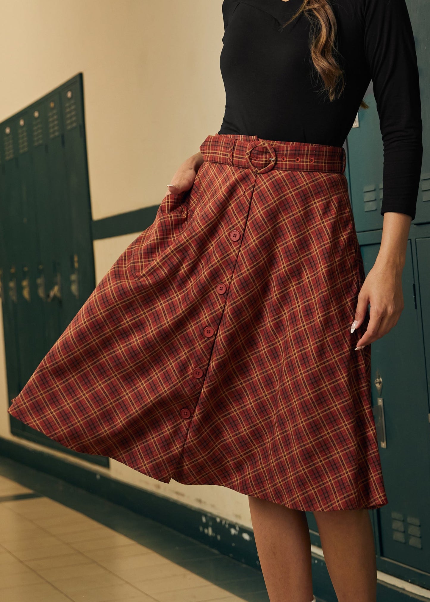 Spin into vintage-inspired charm with the Round of Applause Skirt from our ModCloth namesake label. Designed in a flattering midi length, this skirt features a full silhouette, side pockets, and a button-front detail that adds classic appeal. A matching belt with a round buckle cinches the waist, while the cozy plaid pattern in warm rust tones brings autumn vibes to every twirl.