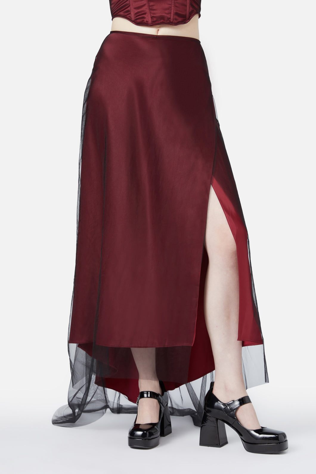 Ignite your gothic glamour with the Sacred Fire Skirt, a dramatic satin masterpiece perfect for those who love a formal yet fierce look. This striking maxi skirt features a fitted waist that flares out elegantly at the hem, giving you a sweeping silhouette. The slit at the side front adds a daring edge, while the satin lining and mesh overlay create luxurious layers of texture and movement.