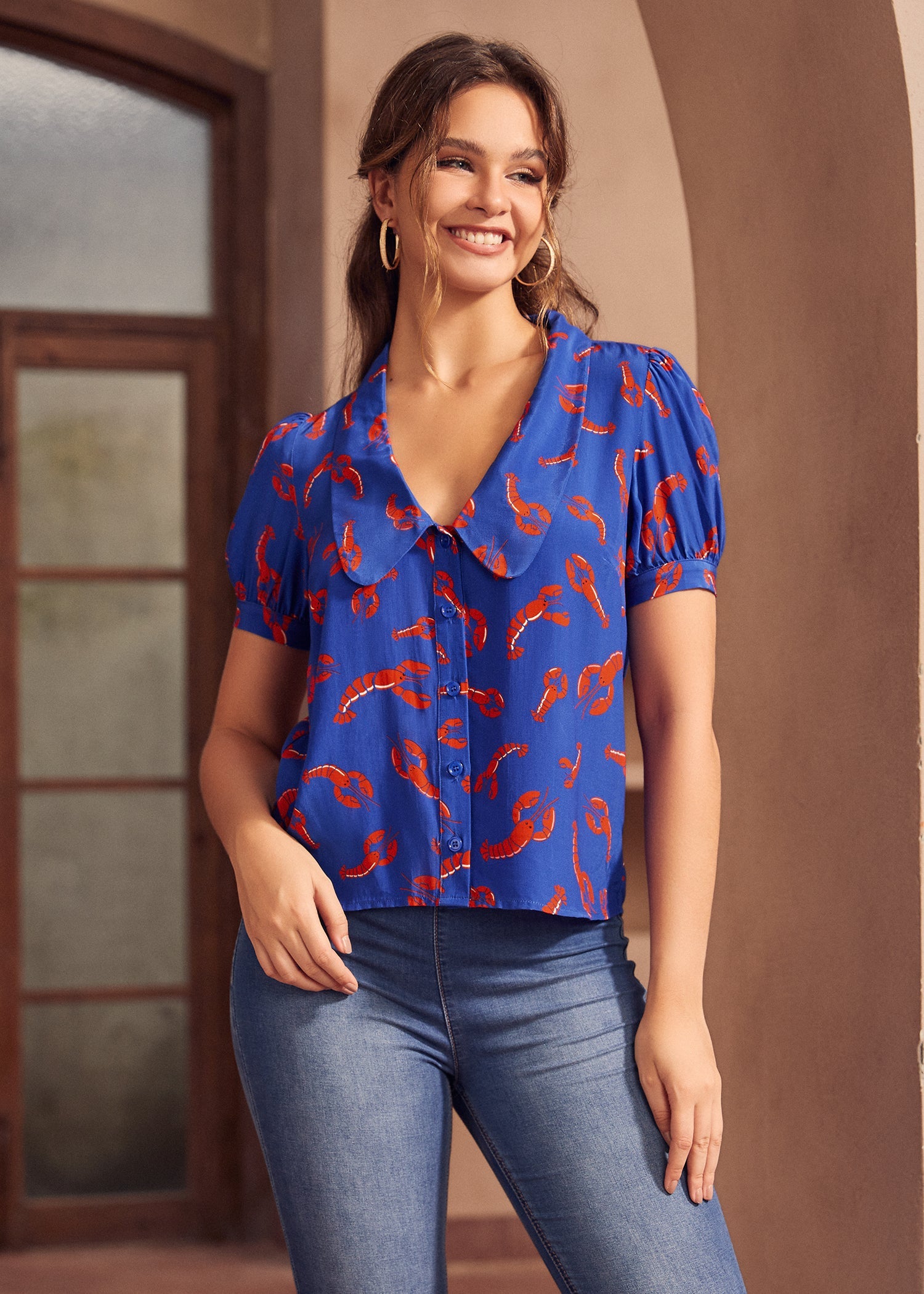 Dive into a sea of style with this unique blouse by our ModCloth namesake label, where playful rock lobsters mingle on a breezy cotton fabric. This piece captures the essence of coastal whimsy with its crisp collar, short sleeves, and button-up front. Versatile for office flair or weekend jaunts by the seaside, it’s a conversation starter that brings a wave of joy and a splash of creativity to your ensemble.