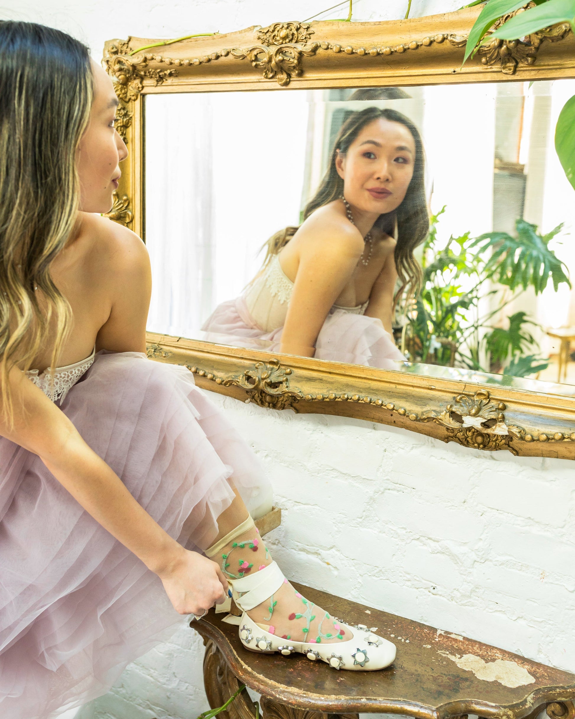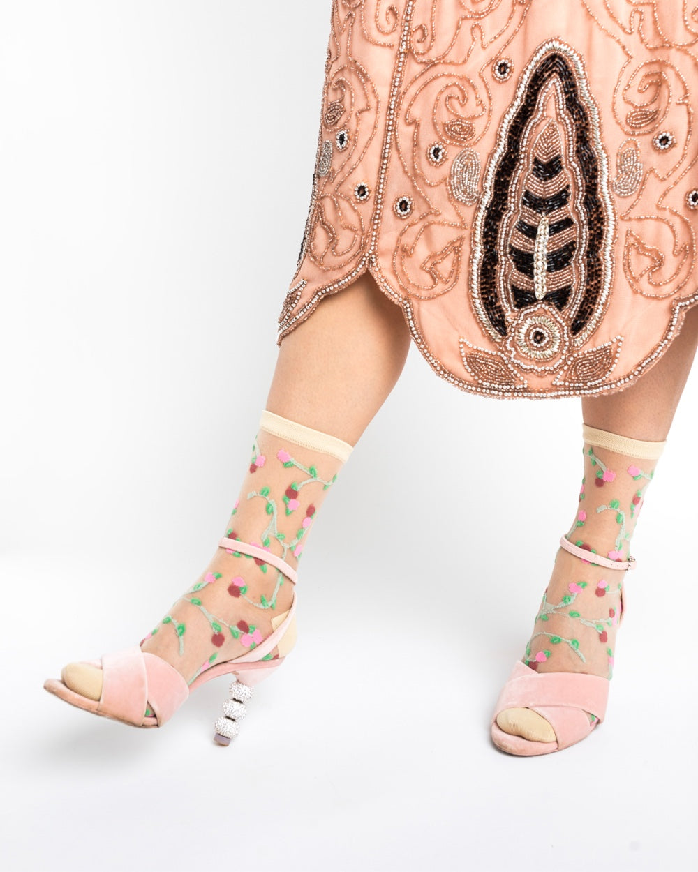 Inspired by Marie Antoinette, small pink rosettes grow on delicate green vines for an organically feminine feel. This pretty sheer floral sock sits slightly higher on the ankle and goes perfectly with midi skirts and peeking out from pants.