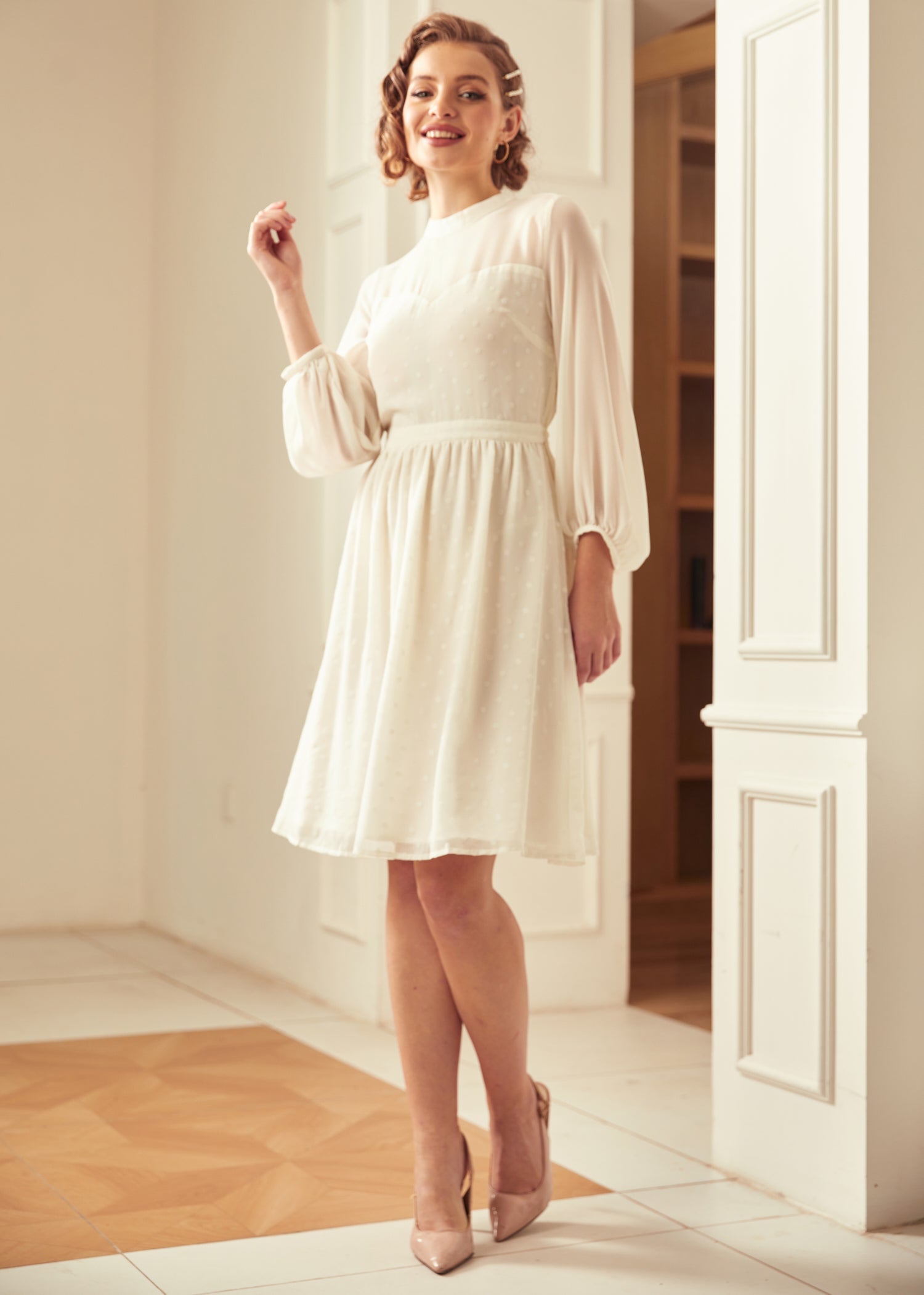 You’re such a stunner on your special day in this ivory-hued chiffon fit-and-flare dress from our ModCloth namesake label. To complement your effervescent elegance, this dress was created with a sheer yoke with a sweetheart silhouette at the chest line, sheer 3/4 blouson sleeves, and a high neckline with button closure that creates a keyhole cut-out to beautifully accent the back. The ivory bodice features an ivory polka-dot print that leads to a shirred high-waistline and a fabulous mid-length flare skirt. You are picture-perfect in this gorgeous A-line dress, and ready to celebrate a very precious occasion.