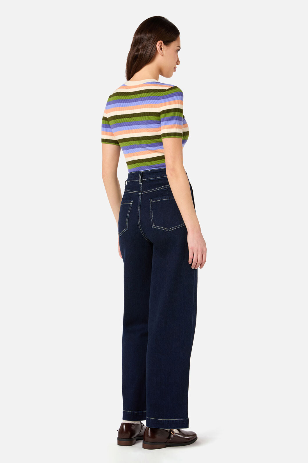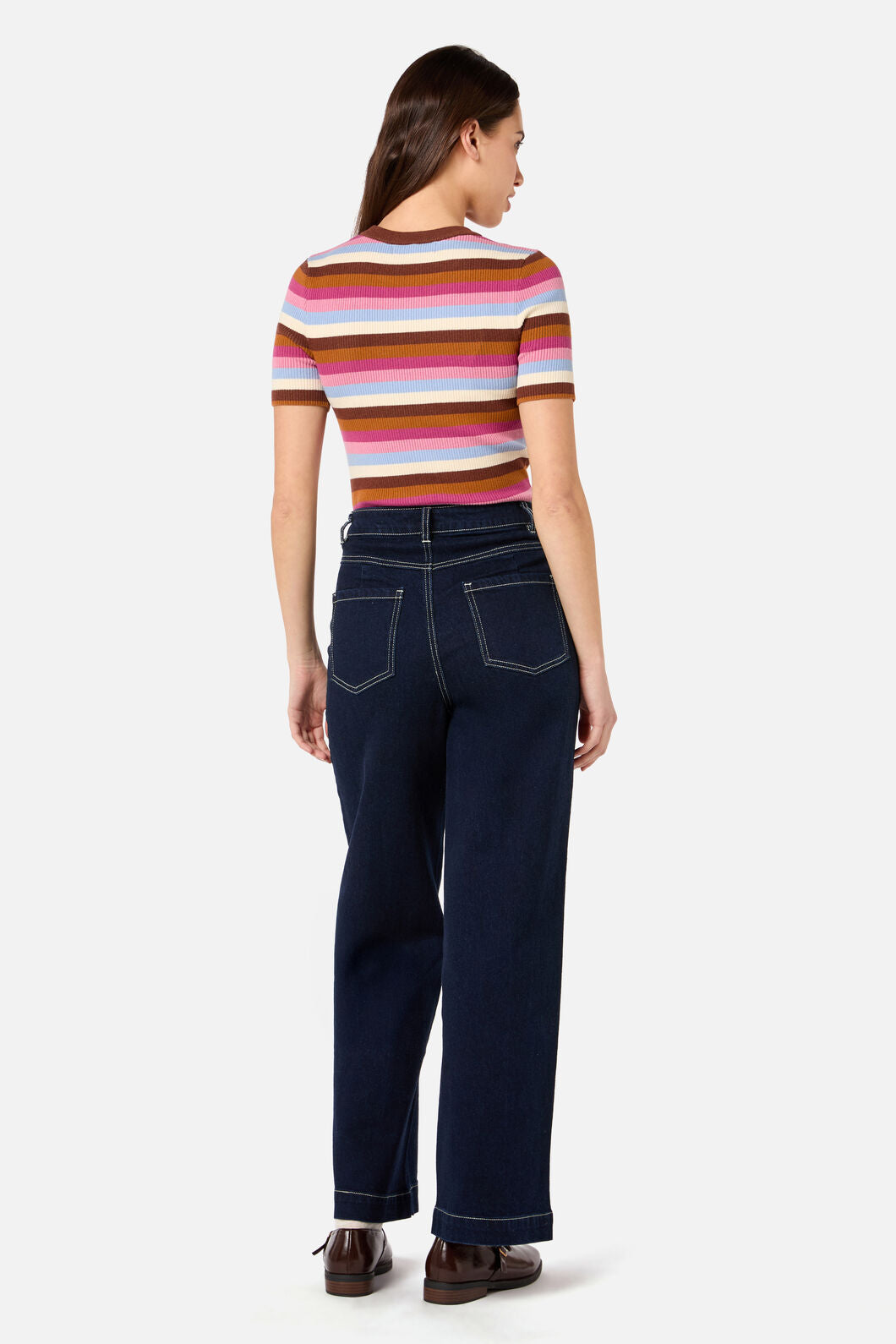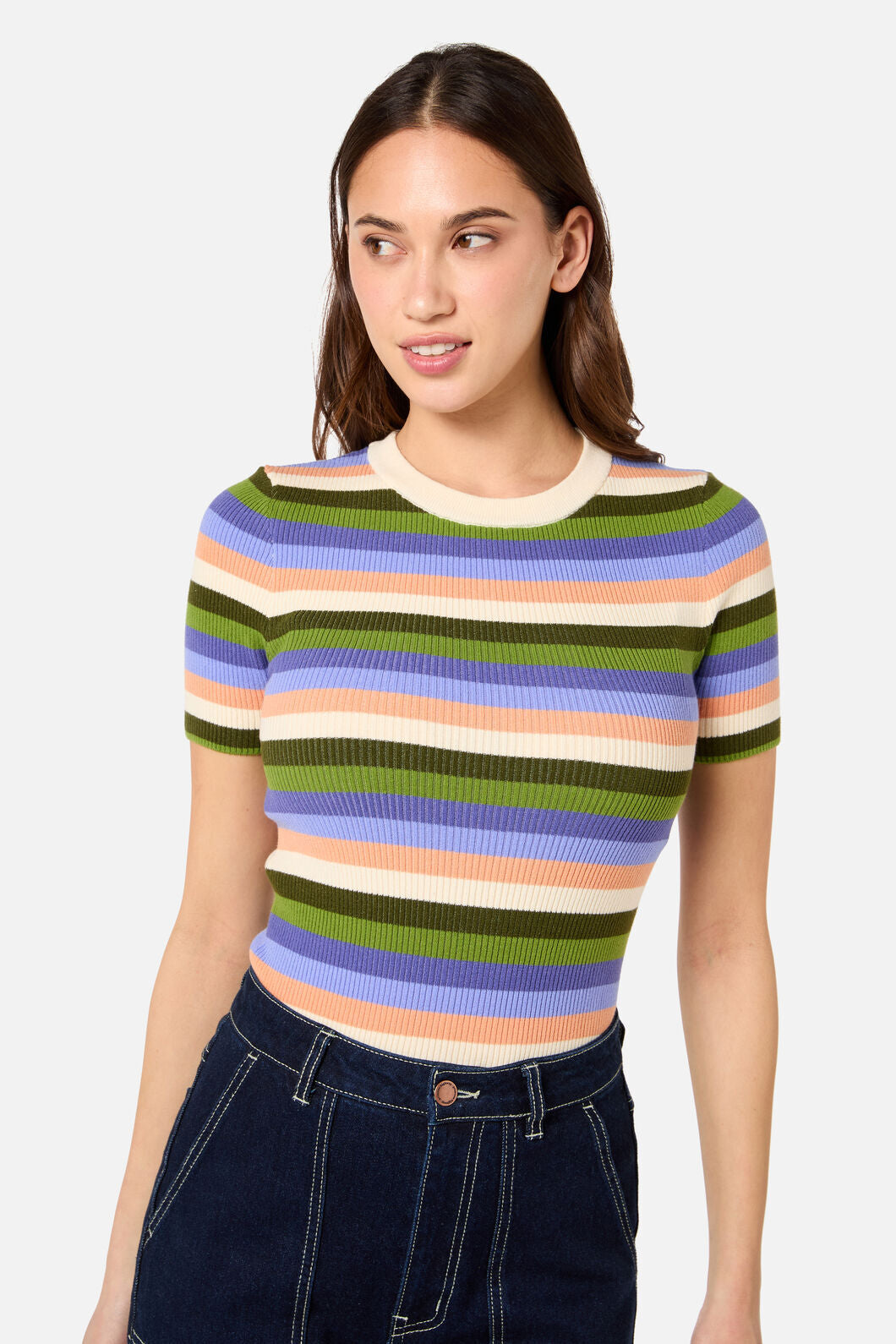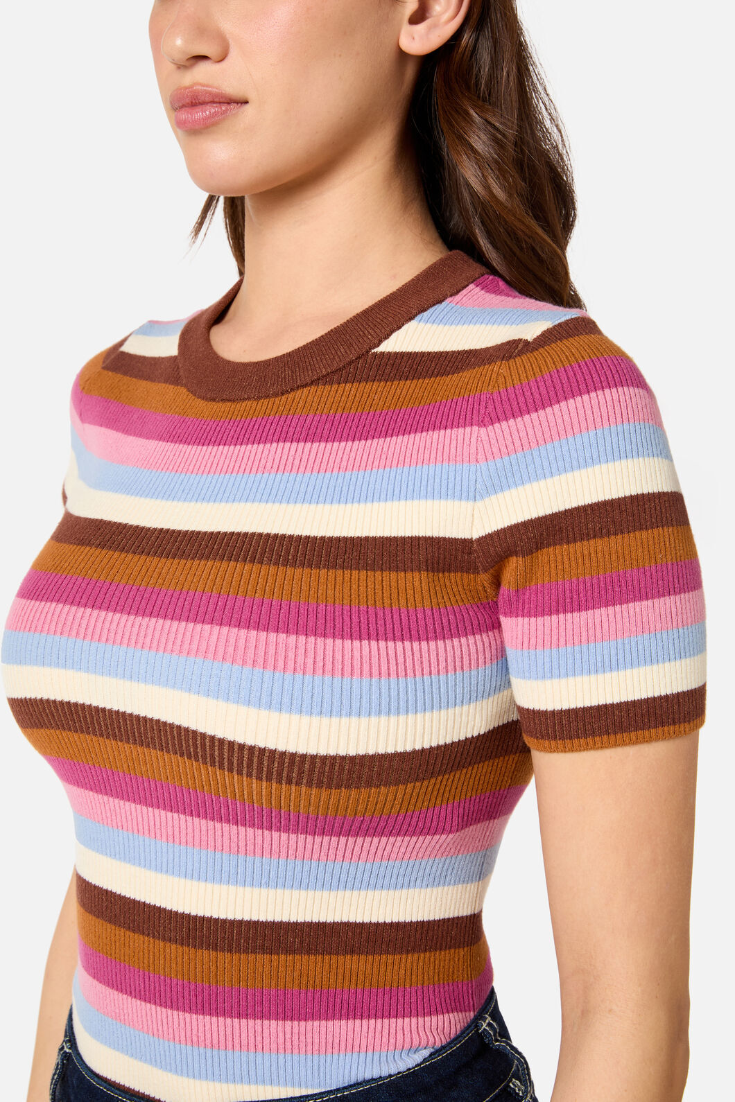 A playful pop of colour in a stretchy, snug knit. This retro-inspired top features bold multicoloured stripes and a flattering fitted shape—perfect for layering or wearing solo.