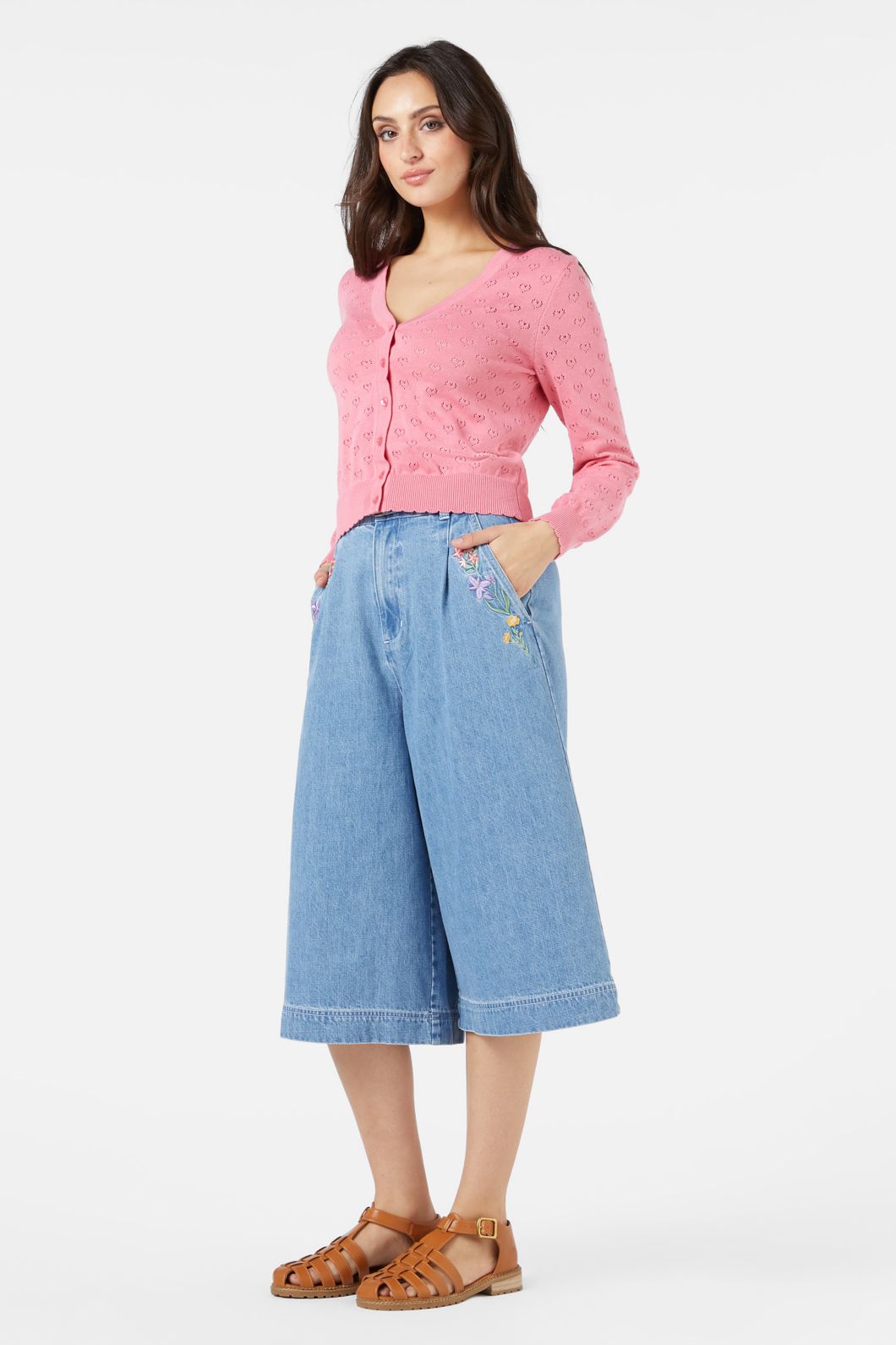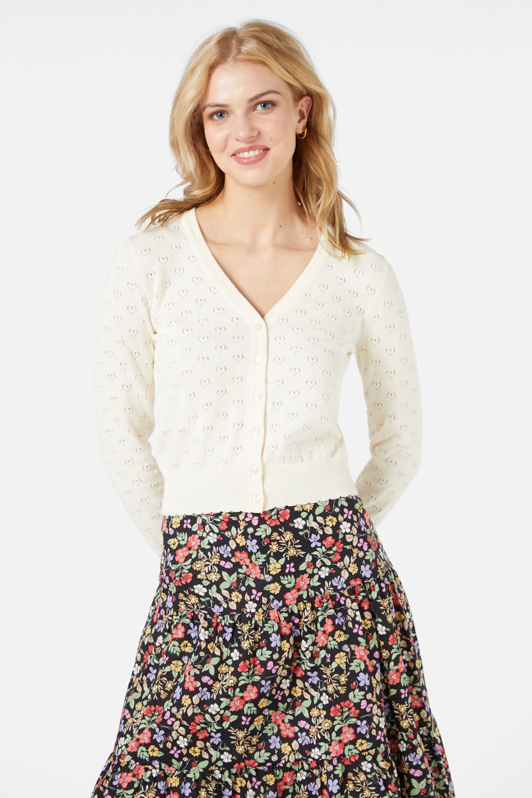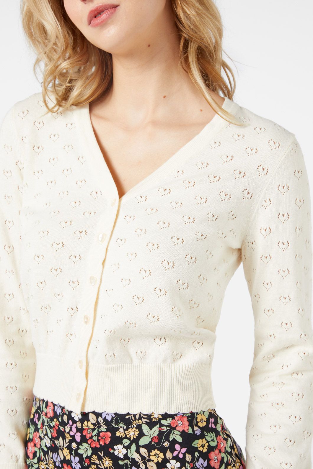 The Suki Cardi is all heart. With its delicate pointelle knit and charming heart-shaped buttons, this lightweight cotton cardigan is the perfect layer for breezy days and soft, romantic styling.