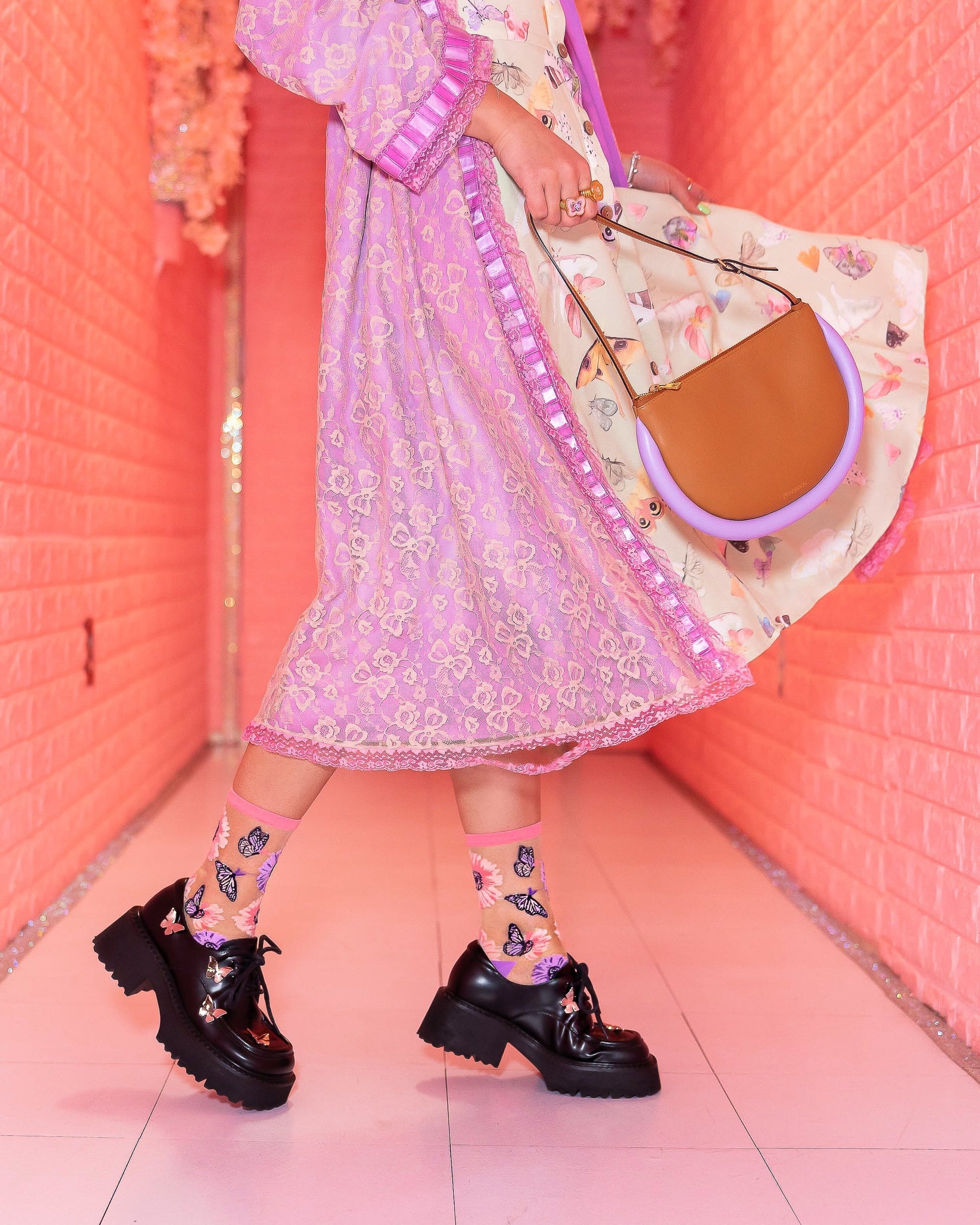 Pink and purple sunflowers make this butterfly floral sock the essence of Spring. As whimsical butterflies make their way up the side of the feet, some bloom into sunflowers for a playful touch. Set against nude sheer fabric for a soft and feminine vibe.