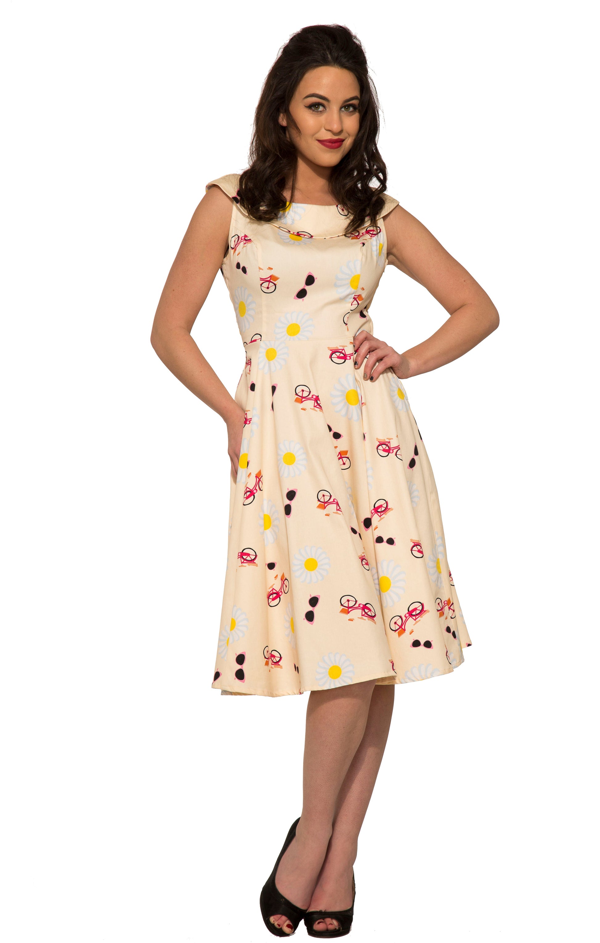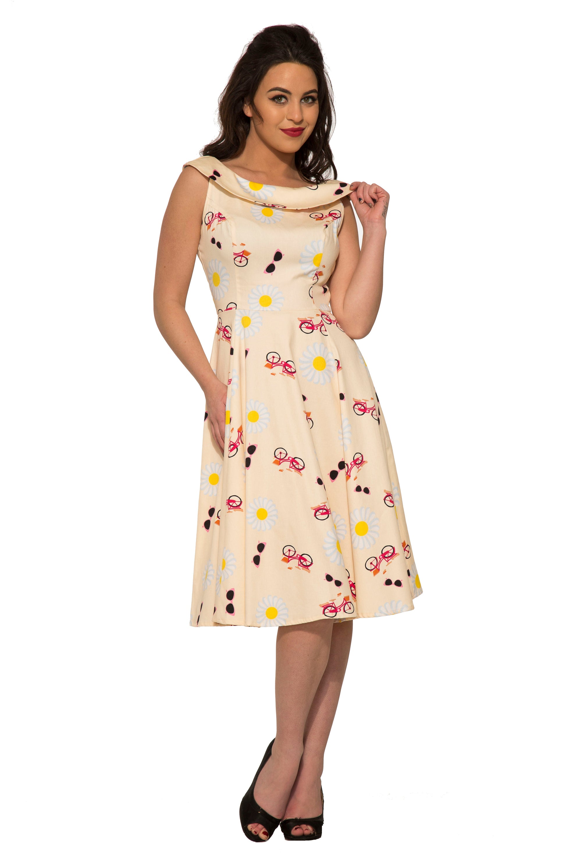 Brighten your day with the whimsical charm of the Orchid Bloom Sunnyside Lane Swing Dress. Featuring a cheerful print of daisies and vintage bicycles on a soft cream background, this dress exudes playful, retro vibes perfect for summer outings and sunny picnics. The gentle drape of the cowl neckline adds a touch of sophistication, while the swing silhouette flatters every curve. Crafted from a cotton-spandex blend for comfort and ease, and finished with a side zipper for a seamless fit.