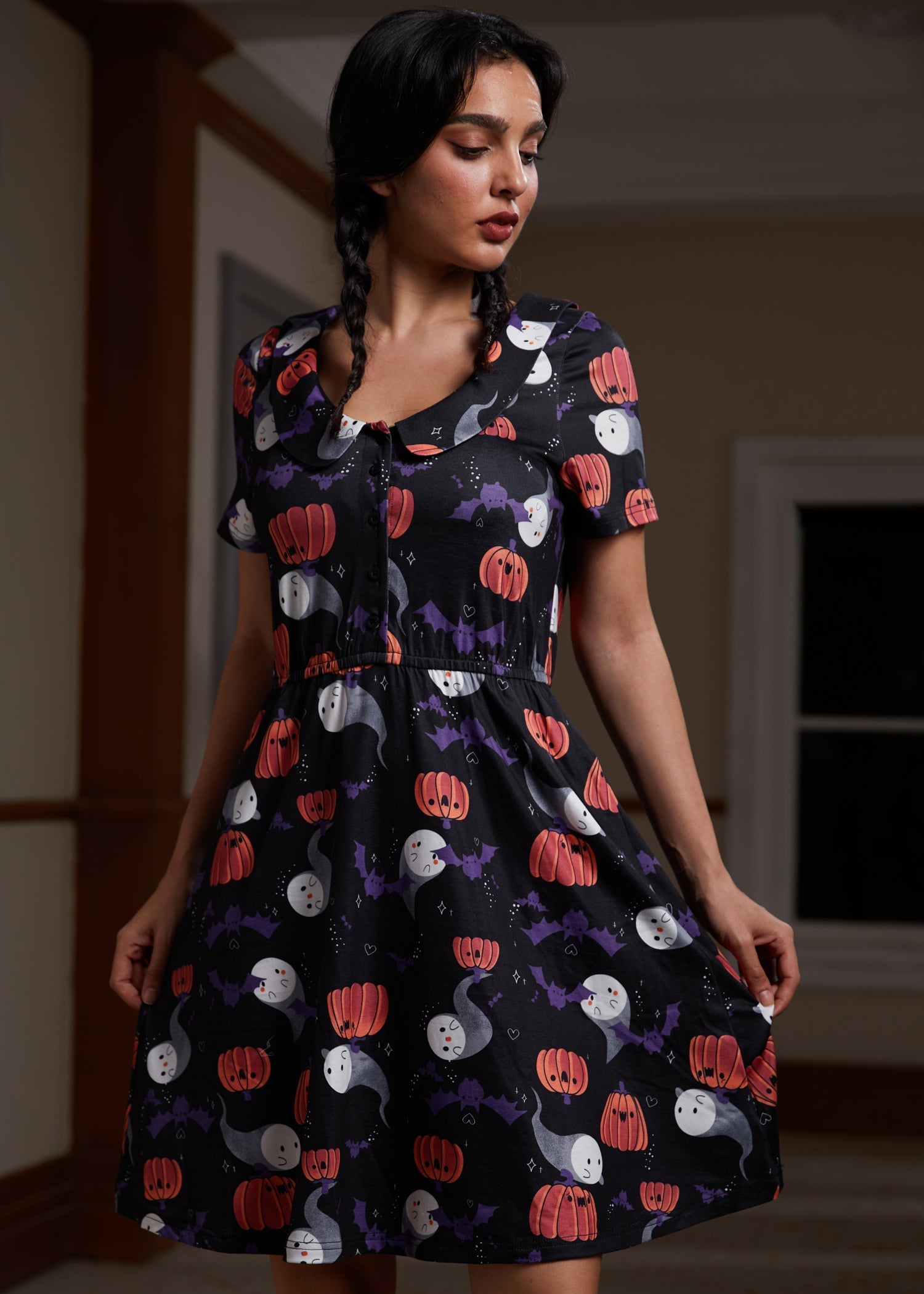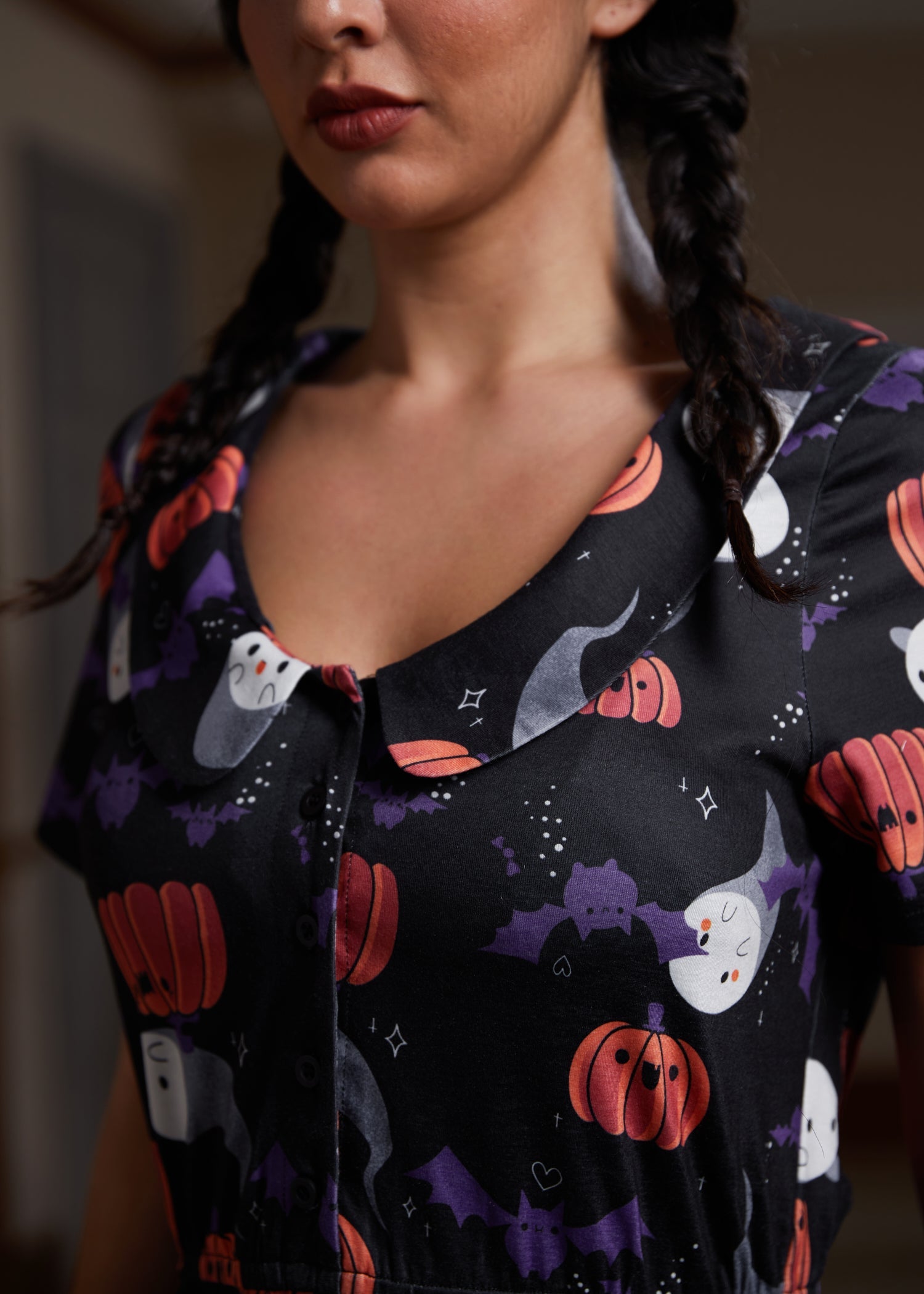 Sweet Shiver of Collared Dress from our ModCloth namesake label, adorned with a charming Halloween print, is the epitome of fall festivity. This dress, created from a cotton-like poly jersey knit with medium stretchability, features a playful button closure and an elastic waistband for a fit that’s both flattering and comfortable. Perfect for Halloween parties or a whimsical day at work, this dress encapsulates the enchanting spirit of the season in every stitch.