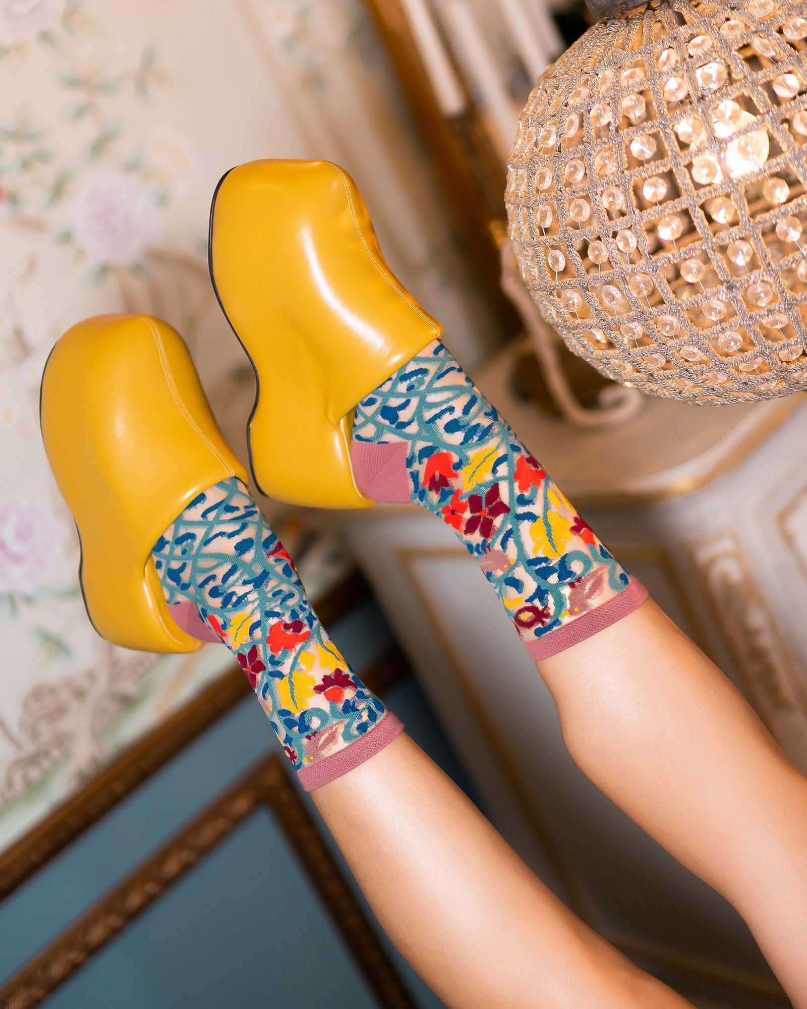 Vintage tapestry vines form into Fall florals, vibrant buds, and whimsical birds on this earthy sheer sock. The duo print design allows you to change up your look and pair with everything from chunky clogs to ankle boots. A bohemian color palette gives this tapestry print sock a free-spirited vibe.