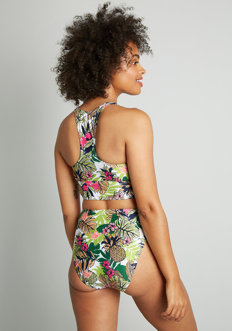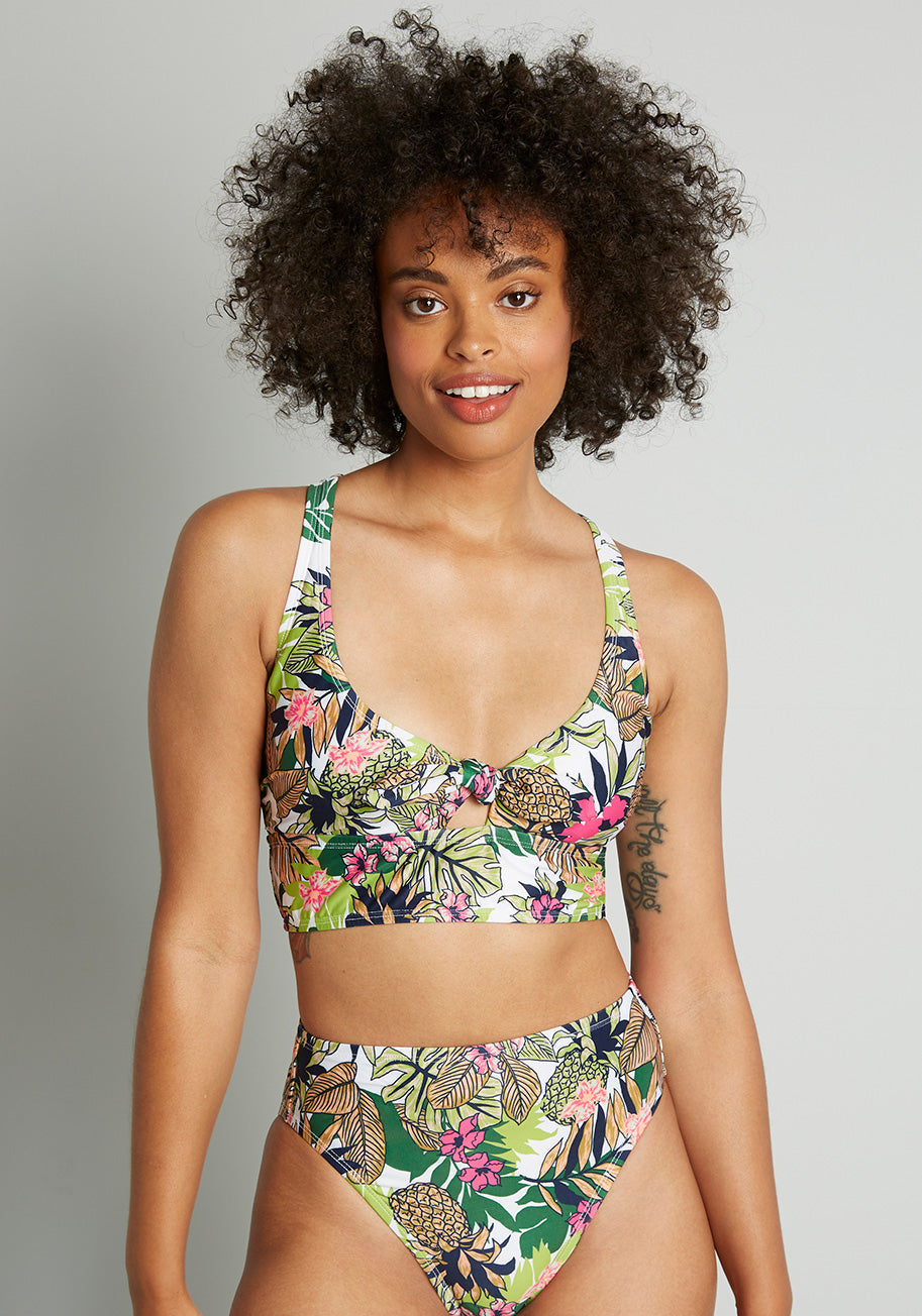 Sporty vibes are met with feminine details to make this white ModCloth namesake label bikini top the quality design that it is. Boasting an exclusive, all over tropical-inspired floral print made-up of green monstera leaves and bright fuschia pink flowers that features coral and navy-blue pineapple motifs scattered throughout, this is a boldly printed crop bikini top that will have you wanting to pair it with as many different bikini bottoms as you can. This bralette features an adjustable tie at the deep scoop neck, thick tank straps, a racerback, and a thick elastic bottom band for extra support. Don’t say we didn’t warn you about it becoming your absolute favorite swimwear piece!
