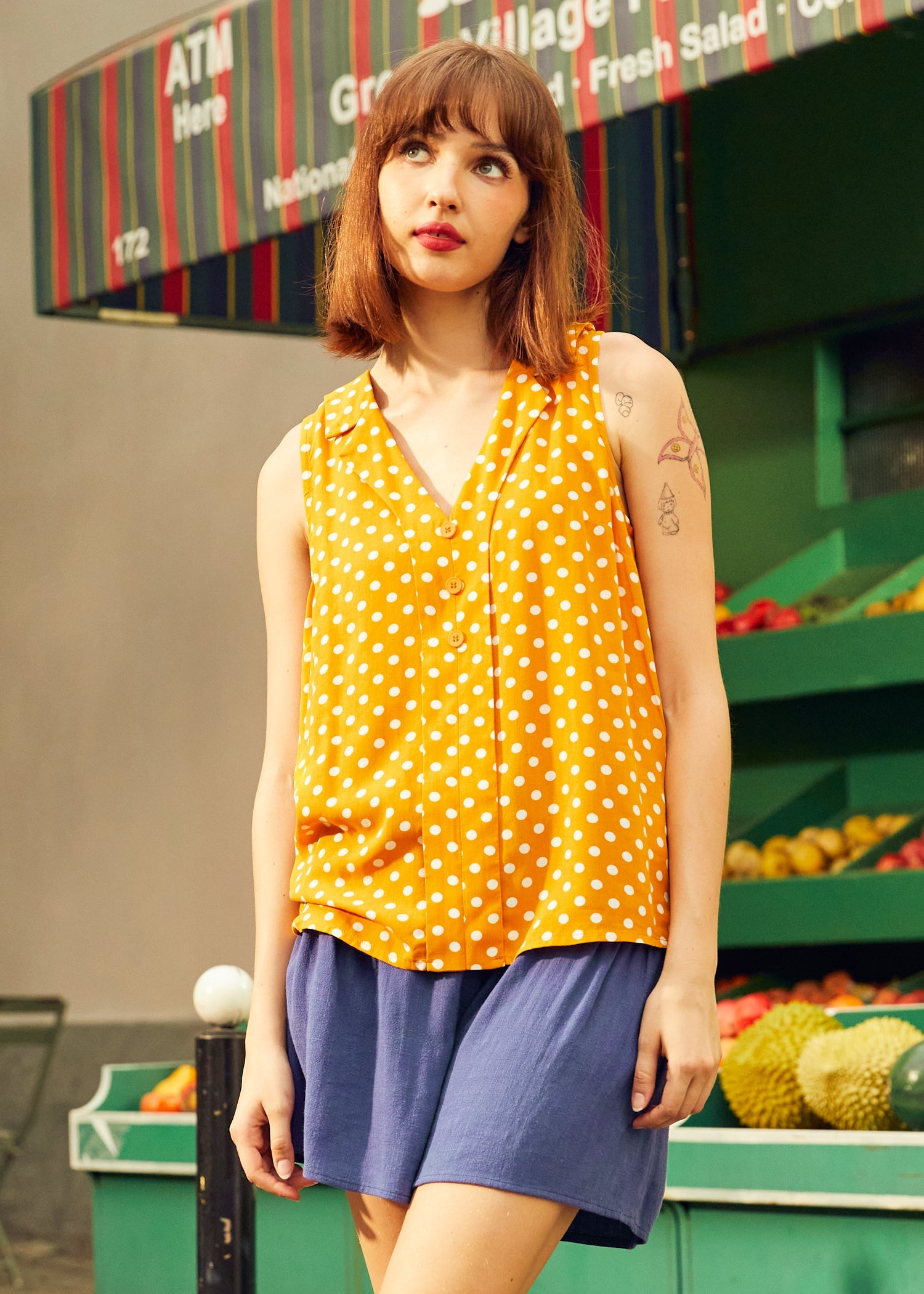 Add a splash of retro charm to your day with The Dotted & Dashing Top, a sunny sleeveless number from our ModCloth namesake label. Featuring crisp white polka dots on a golden yellow base, a notched collar, and a button-front placket, this top pairs perfectly with high-waisted skirts, denim, or whatever you’re feeling fabulous in. It's as cheerful as your favorite soda pop—and twice as sweet.