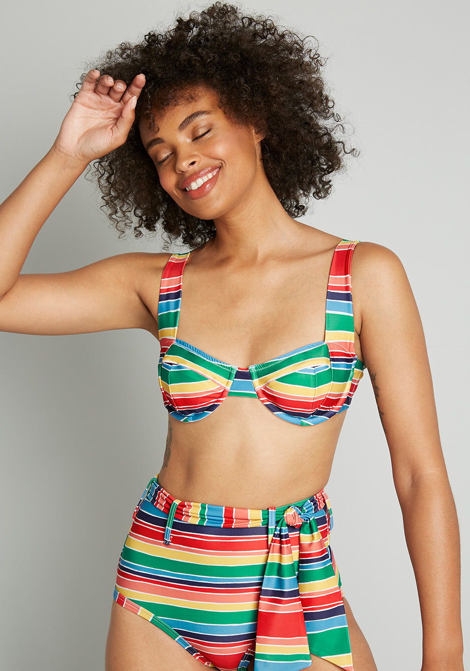 With the inspiration of old Hollywood beauties and 1970s floral prints, this ModCloth namesake label underwire bikini top is vintage-inspired perfection. Featuring adjustable straps that have subtle shirred detailing at the neckline for dramatic and flattering effect, structured cups with removable pads, and an adjustable hook closure at the back, this yellow swimsuit top is perfect for adding into your swimwear rotation. Boasting a playful rainbow stripe print in shades of green, red, blue, yellow, orange, and pink atop a yellow background, you will be finding any excuse to wear this bathing suit top while under the sun and in the water.