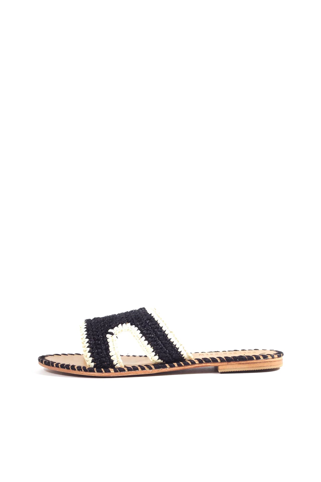 These black and beige colorblock slip on raffia THEO slides by Chelsea Crew have been handcrafted using traditional weaving techniques. They are framed with whipstitching around the durable leather footbed. Wear them with everything this summer, from breezy maxi dresses to cutoff shorts.
