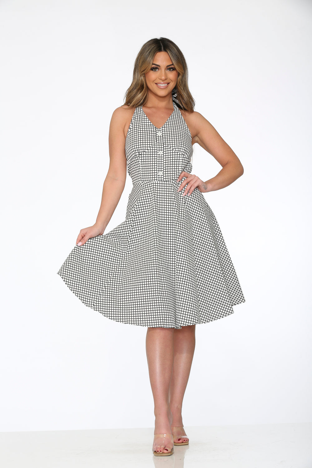 Play your winning style move with the Orchid Bloom White & Black Checkmate Halter Swing Dress! With its bold checkerboard print and classic halter neckline, this retro beauty brings vintage flair and playful confidence to every twirl. Crafted from a breathable cotton-spandex blend, it’s perfect for sunny days, dance nights, and making a statement wherever you go.
