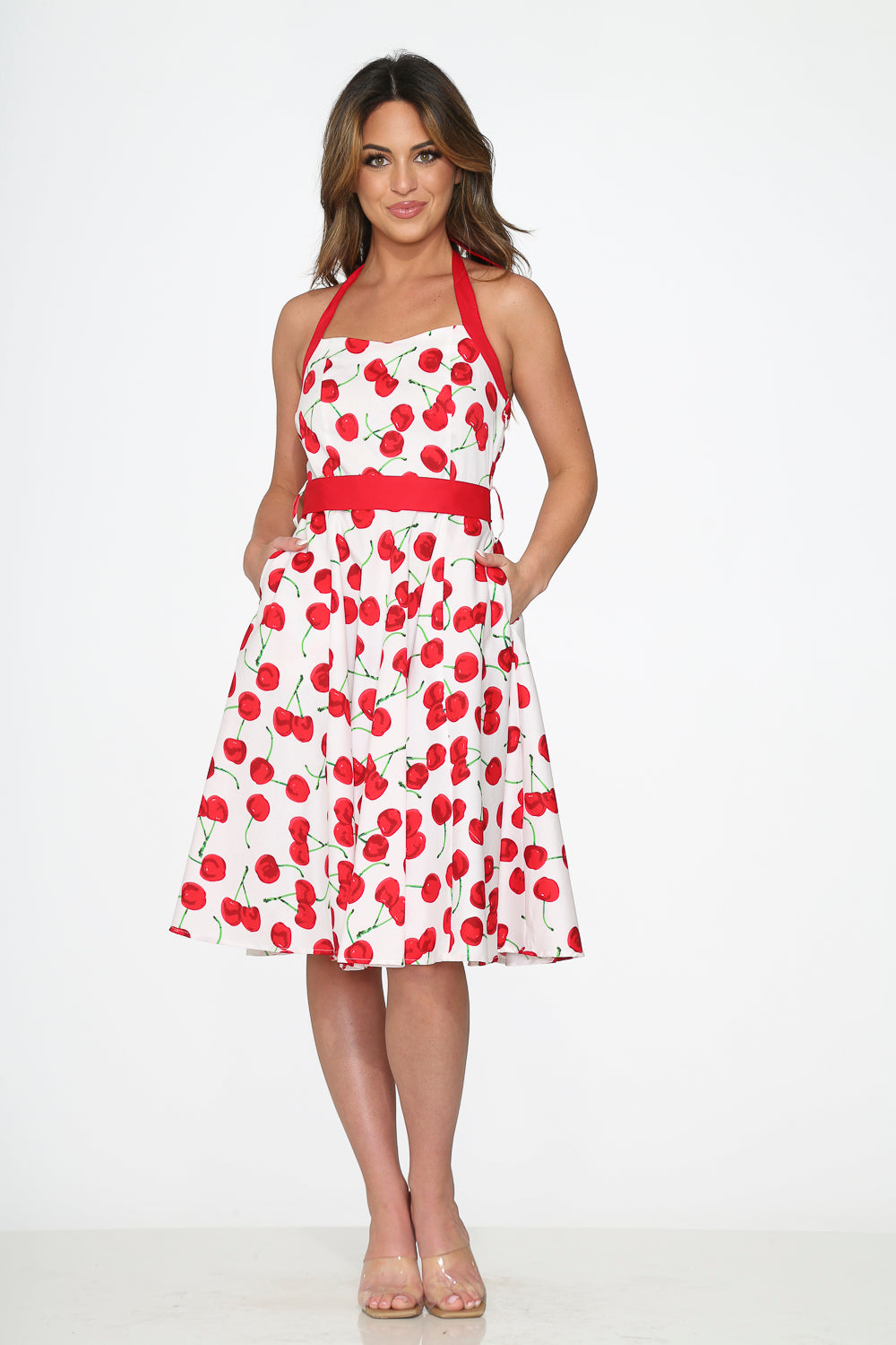Sweet and sassy, the White Red Cherry Halter Swing Dress by Orchid Bloom is a retro delight. Featuring a classic halter neckline and a bold red cherry print on a crisp white background, this swing dress brings a flirty, pin-up vibe to warm-weather days.
