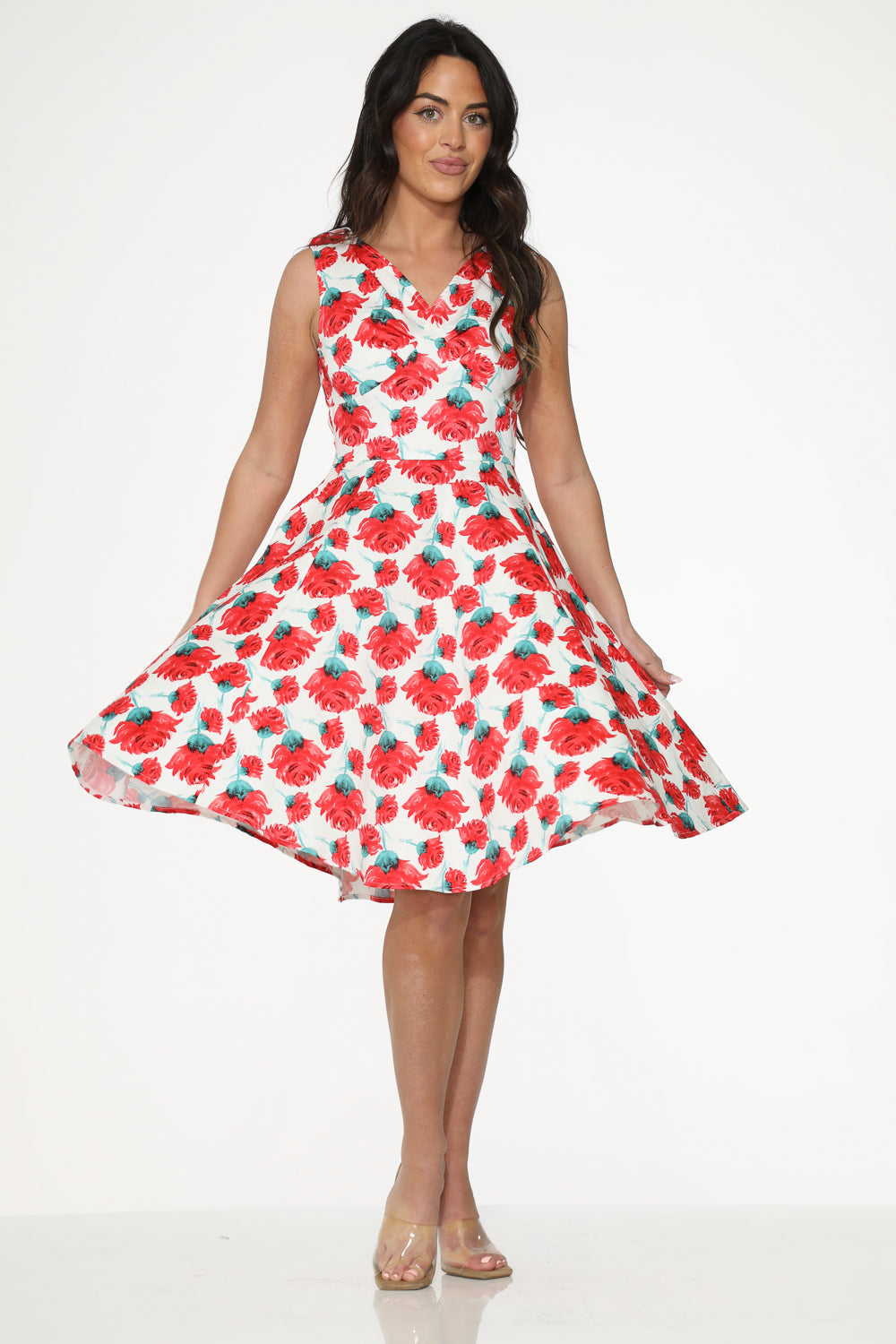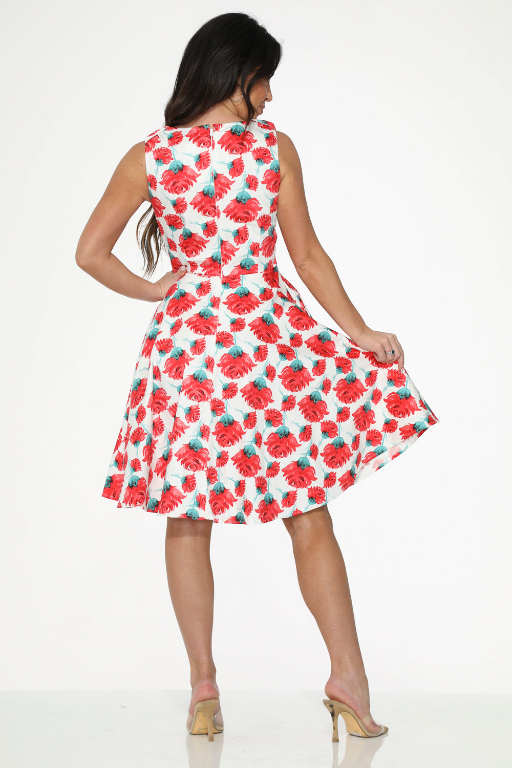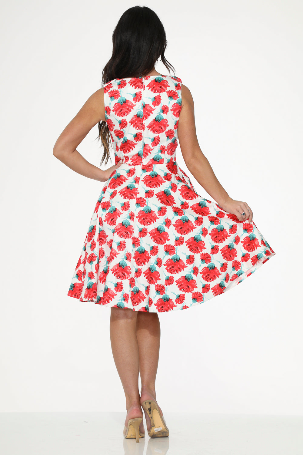 Romance is always in bloom with the Orchid Bloom White & Red Rose Swing Dress. Featuring a garden of bold red roses on a crisp white canvas, this vintage-inspired beauty is as classic as it is captivating. With its flattering fitted bodice, full swing skirt, and soft stretch cotton blend, it’s perfect for picnics, parties, or your next swoon-worthy entrance.