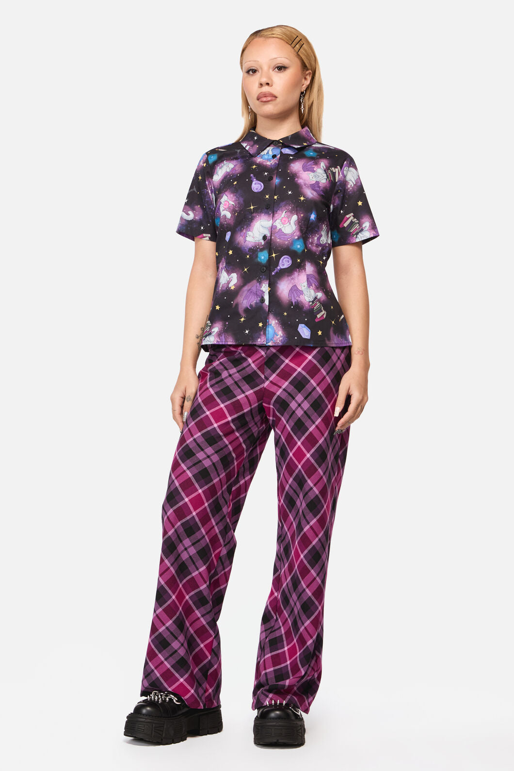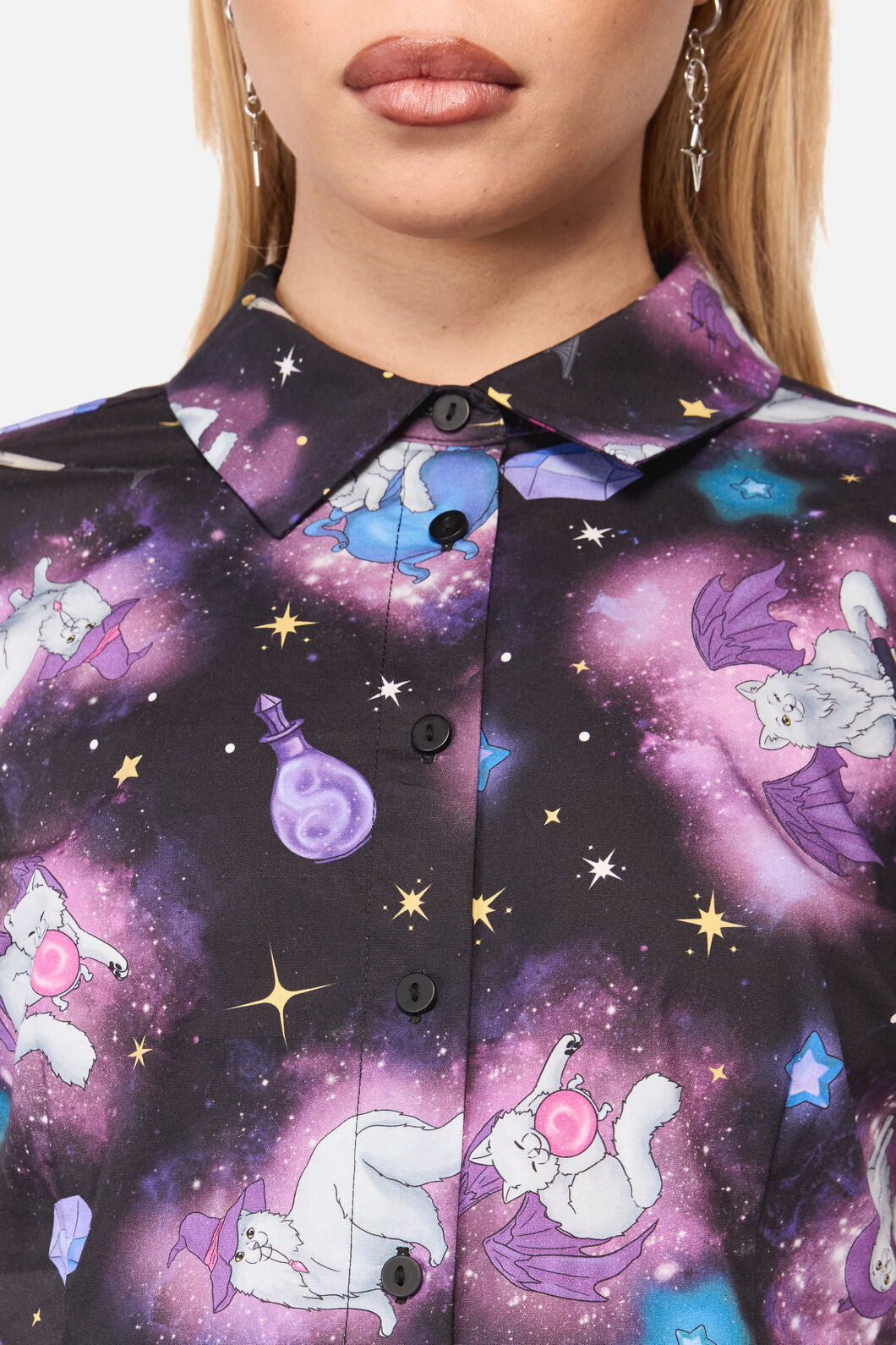 Ooky spooky in the best way! This short sleeve blouse is a subtle nod to our favorite holiday—Halloween—with haunted cat print that’s purr-fect for every goth girlie with a soft side. A must-have for cat lovers and spooky season stans alike.