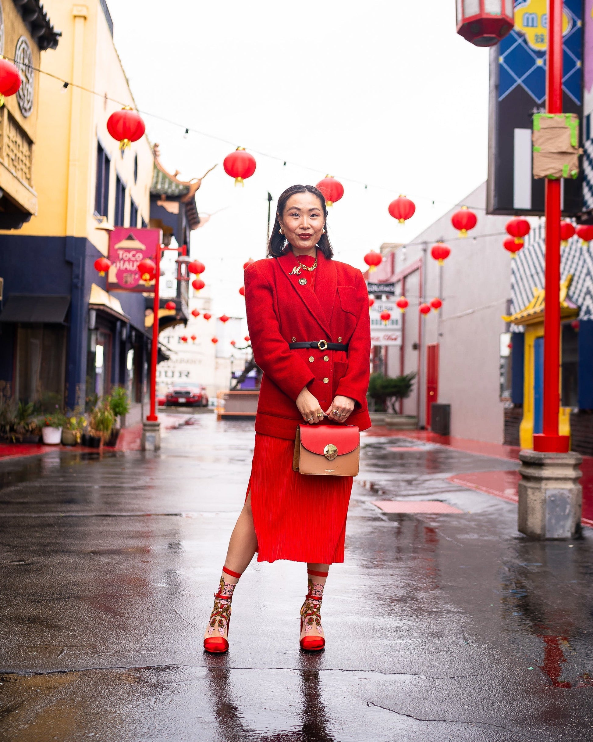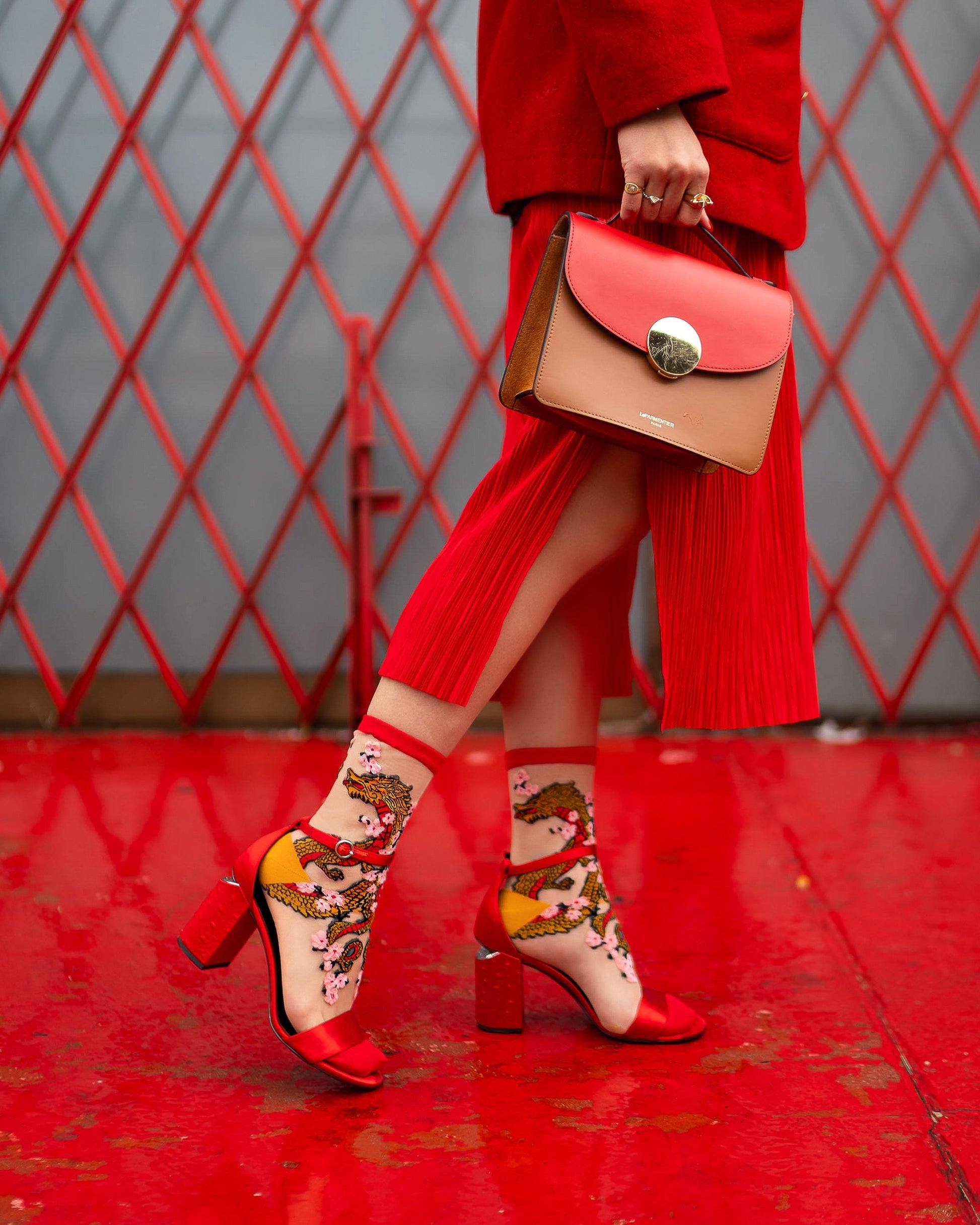 Celebrate Lunar New Year with our stunning Year of the Dragon sock, paying homage to our Founder's heritage. Two gold and red dragons mirror each other and intertwine, creating perfect symmetry from the front view and a full dragon from the side view. Cherry blossoms give this sheer dragon sock a feminine and unexpected touch. Pair with red shoes and wear all February, from Chinese New Year to Valentine's Day.Â